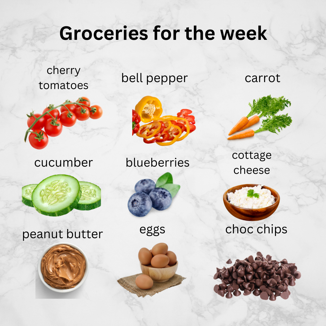 I have to laugh because I just created my little image of “groceries for the week” and how amazing would it be if those were the only groceries I bought?! On this particular week I spent an absurd amount of money because not only had I not gone shopping in about two weeks but I also bought a lot of other random ingredients thinking of meals I might make and also lots of snackies… SO, just know – there were sooo many more groceries than that.